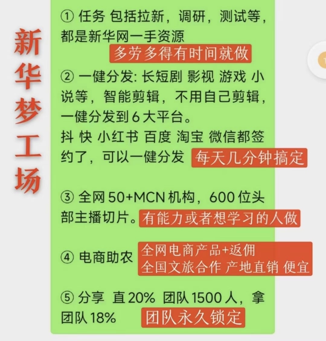 2、那么新华任务分发具体是做什么的呢?它又得到了哪些部门的扶持呢?新华梦工厂主要致力于打造新华网新质版权矩阵系统。它得到了商务部电商司、网信办综合局、市场监督总局等相关部委的支持。这是一个由新华网创办的综合赋能平台,基于 AIGC 新质生产力,开展切片分发、商单分发、AIGC 内容生成、广告分发以及本地生活服务等多项业务的全新赋能平台。